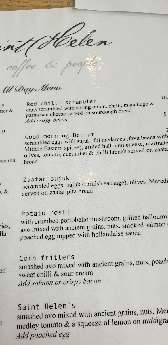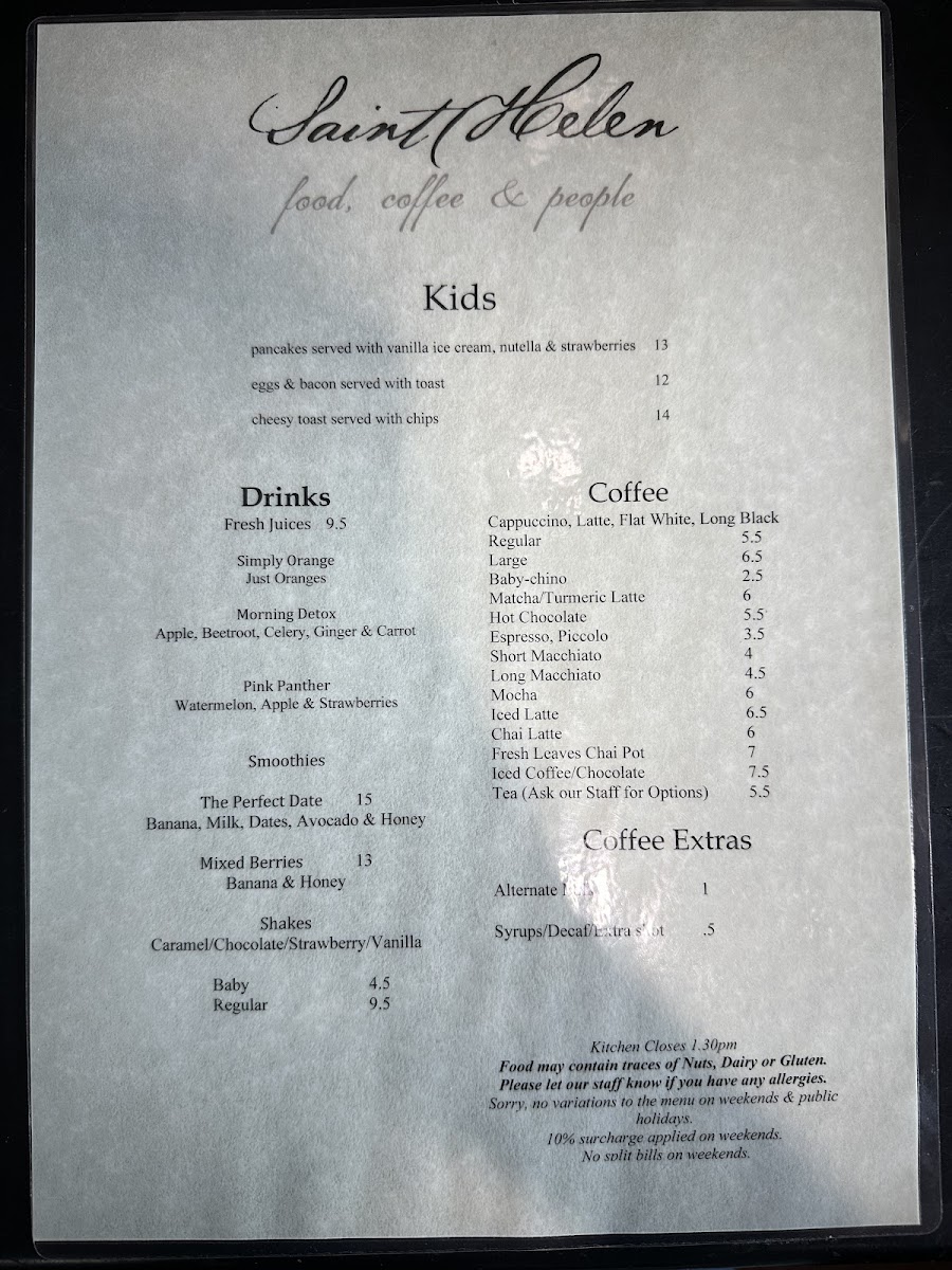 Nestled in the heart of Hawthorn at 173 Riversdale Rd, Saint Helen Cafe invites you to embark on a delightful culinary journey like no other. Our menu, thoughtfully crafted to tantalize your taste buds, boasts a captivating selection of beloved classics and innovative creations. Start your day with our hearty Beirut or perfectly seasoned Scrambled Eggs, and pair it with a creamy Latte or a robust Long Macchiato for the perfect morning boost. If you crave something to snack on, our New York Bagel and Pistachio Cup Cake are sure to satisfy. For a more wholesome choice, try the Greens and Grains or indulge in the delightful blend of Potato Rosti with Smoked Salmon or Bacon. And don't miss out on our refreshing Mixed Berry Smoothie. Whether you’re after a cozy cappuccino or an afternoon pick-me-up, Saint Helen Cafe promises more than just a meal—it offers an experience. Come for the food, stay for the atmosphere, and leave with unforgettable memories.